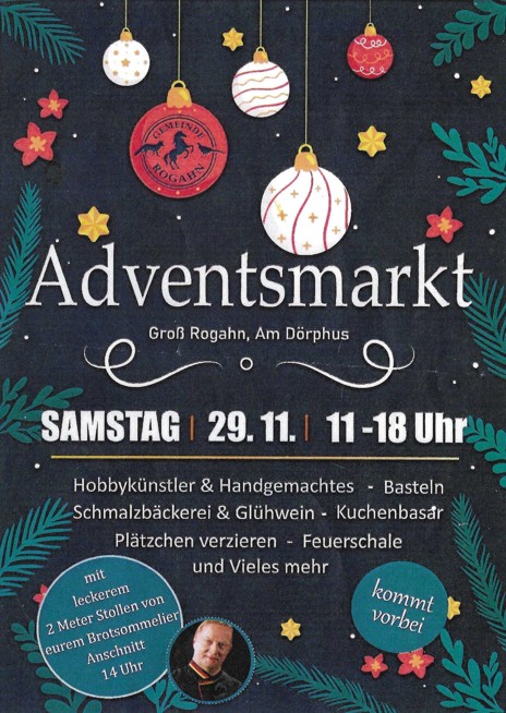 Am 29.11.2025 findet in Groß Rogahn im Dörphus von 11 bis 18 Uhr der Adventsmarkt statt. Zu Erleben gibt es Hobbykünstler und Handgemachtes, Basteln, Schmalzbäckerei und Glühwein, Kuchenbasar, Plätzchen verzieren, Feuerschale und vieles mehr.