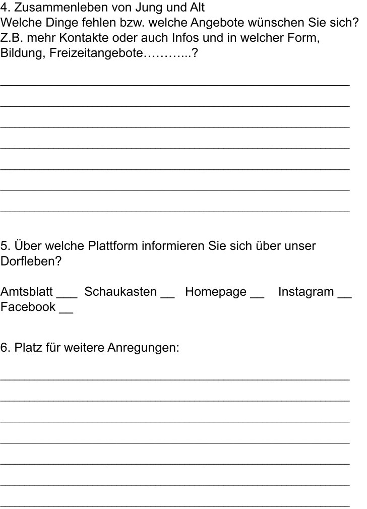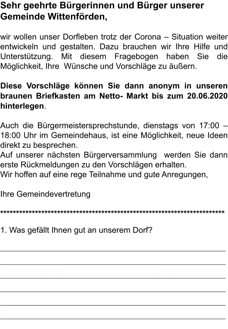 Und da kommt unsere Bürgerbefragung ins Spiel. Wir wollen von Ihnen wissen, was gefällt, was fehlt und welche Ideen Sie haben. Wer den Flyer nicht erhalten hat, kann ihn gerne herunterladen. Oder Sie beantworten einfach die Fragen auf einem separaten Blatt und werfen alles bis zum 20.06.2020 in den neuen Gemeindebriefkasten am Netto.